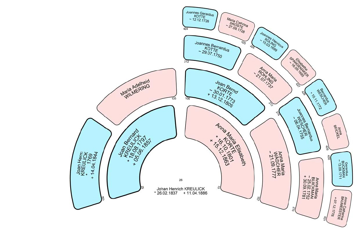 Y-DNA Johannes Hermans mt-DNA Elisabeth Brörmann Y-DNA Heinrich Wehberg mt-DNA Friederike Brackel Y-DNA Heinrich Schnermann mt-DNA Anna Ostrick Y-DNA Theodor Schumacher mt-DNA Elisabeth Middeke Y-DNA Johann Schöttler mt-DNA Barbara Grunau