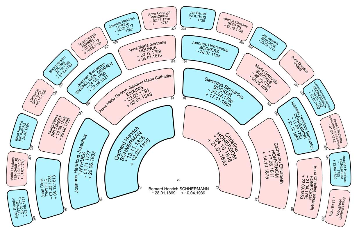 Y-DNA Johannes Hermans mt-DNA Elisabeth Brörmann Y-DNA Heinrich Wehberg mt-DNA Friederike Brackel Y-DNA Heinrich Schnermann mt-DNA Anna Ostrick Y-DNA Theodor Schumacher mt-DNA Elisabeth Middeke Y-DNA Johann Schöttler mt-DNA Barbara Grunau