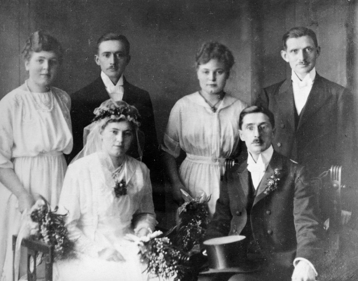 Trauung Maria Schumacher und Leo Hasters 13.01.1920 v.l.n.r.: Liesel Schumacher - NN. - Maria Hasters, geb. Schumacher - Hermine Schumacher - Leo Hasters – NN.